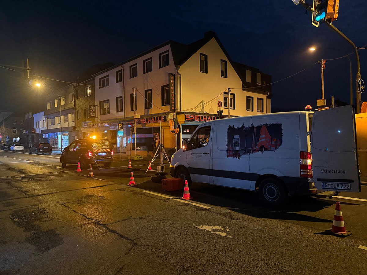 Eine 3D-Bauwerksvermessung an einer viel befahrenen Hauptverkehrsstraße muss nachts erfolgen, um den Verkehrsfluss möglichst wenig zu stören. In diesem Fall haben wir von 2 Uhr bis 4 Uhr nachts gearbeitet.